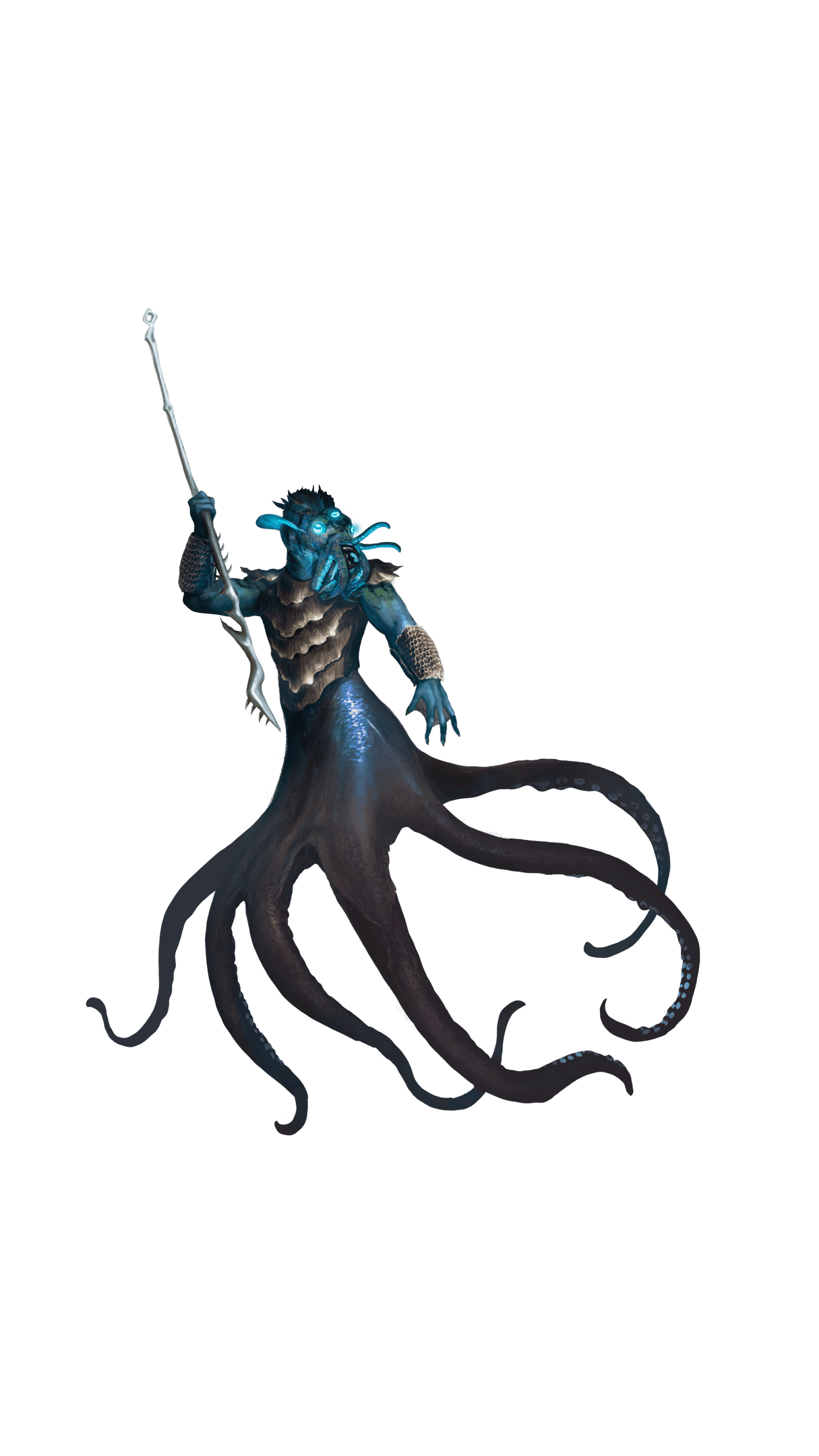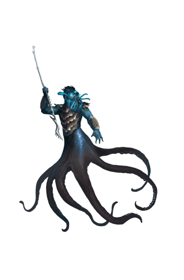 Members of the Sephalo tribe have soft, relatively weak bodies with muscular tentacles that allow them to propel themselves quickly through the water and also move proficiently on land. They compensate for their fragile bodies with proportionately larger brains that make them much more intelligent than the other tribes. They have bulbous, domed heads, three eyes, and a razor-sharp beak hidden beneath smaller tentacles on their faces. They have eight appendages in total which they can utilize to perform multiple tasks at once. Two resemble thin human arms with a webbed hand on each. The other six are tentacles with gripping suckers all along them.