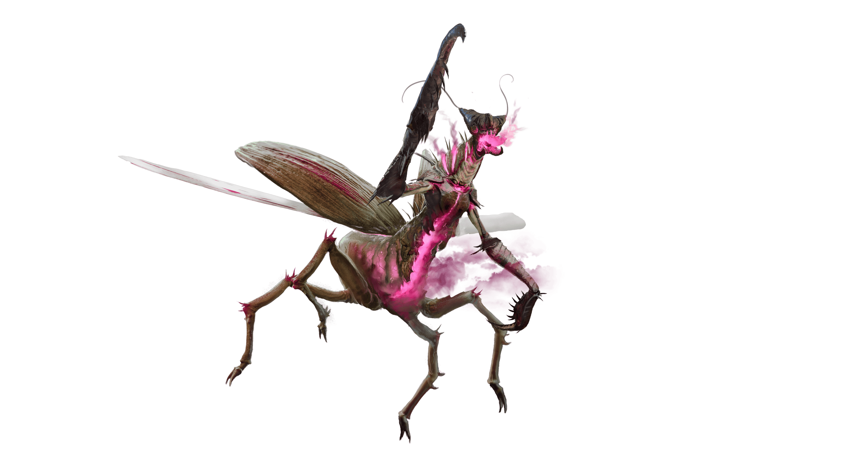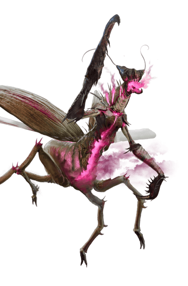 They have thin, agile bodies protected by a hard, spiked carapace. They have two large, bladed arms, four thin legs, and two retractable wings that fold out from under their carapace. They move extremely fast and have lightning-quick reflexes.